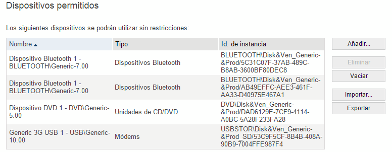 Una vez tenga la lista de dispositivos permitidos finalizada, podrá exportarla a un archivo de texto. Esta operación también puede realizarse, lógicamente, a la inversa: es decir, usted configura en un archivo de texto la lista con los datos de los dispositivos que desea permitir y a continuación importa esa lista desde la consola Web de Endpoint Protection.
