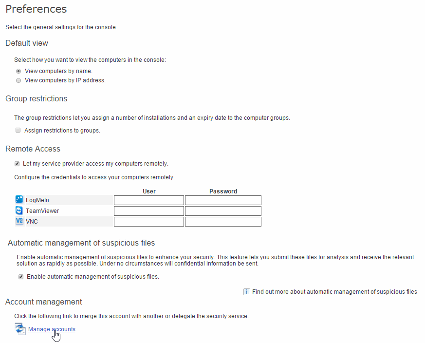 If you are a user with total control permissions, you will have access to the account management features provided by Endpoint Protection: delegating account management and merging accounts.