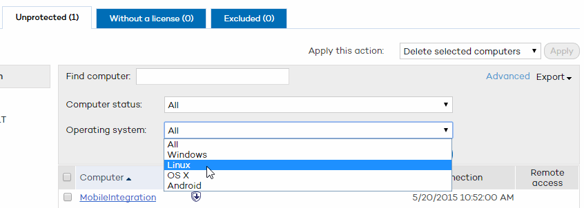 A computer may appear as unprotected when the protection is being installed/uninstalled, when there was an error installing/uninstalling the protection or when the computer has been discovered through a search.
