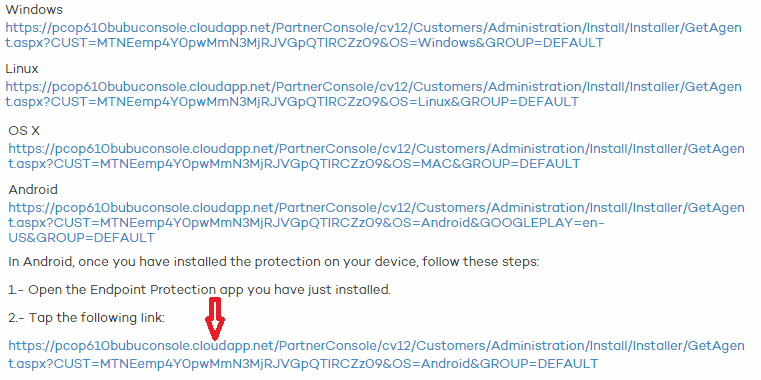 End users will automatically receive an email message with two URLs. The first one is the installation URL. Clicking it will take the user to the Endpoint Protection page in Google Play to install the protection.