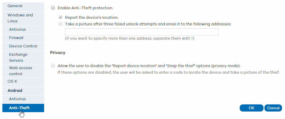 A protecao Antirroubo incluida no Endpoint Protection dar-lhe-a controlo total sobre os seus dispositivos Android e permitira a realizacao de uma conjunto de acoes em caso de roubo.
