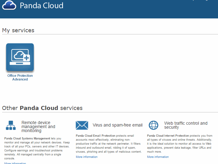 Em seguida, entrara no site Panda Cloud. A partir dai, podera comecar a aceder a sua consola do Endpoint Protection. Para isso, basta clicar no icone da solucao na secao Os meus servicos.