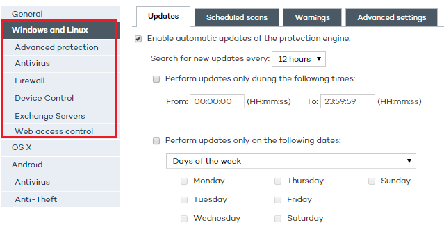 Every protection module applicable to Windows computers has its own section in the side menu.